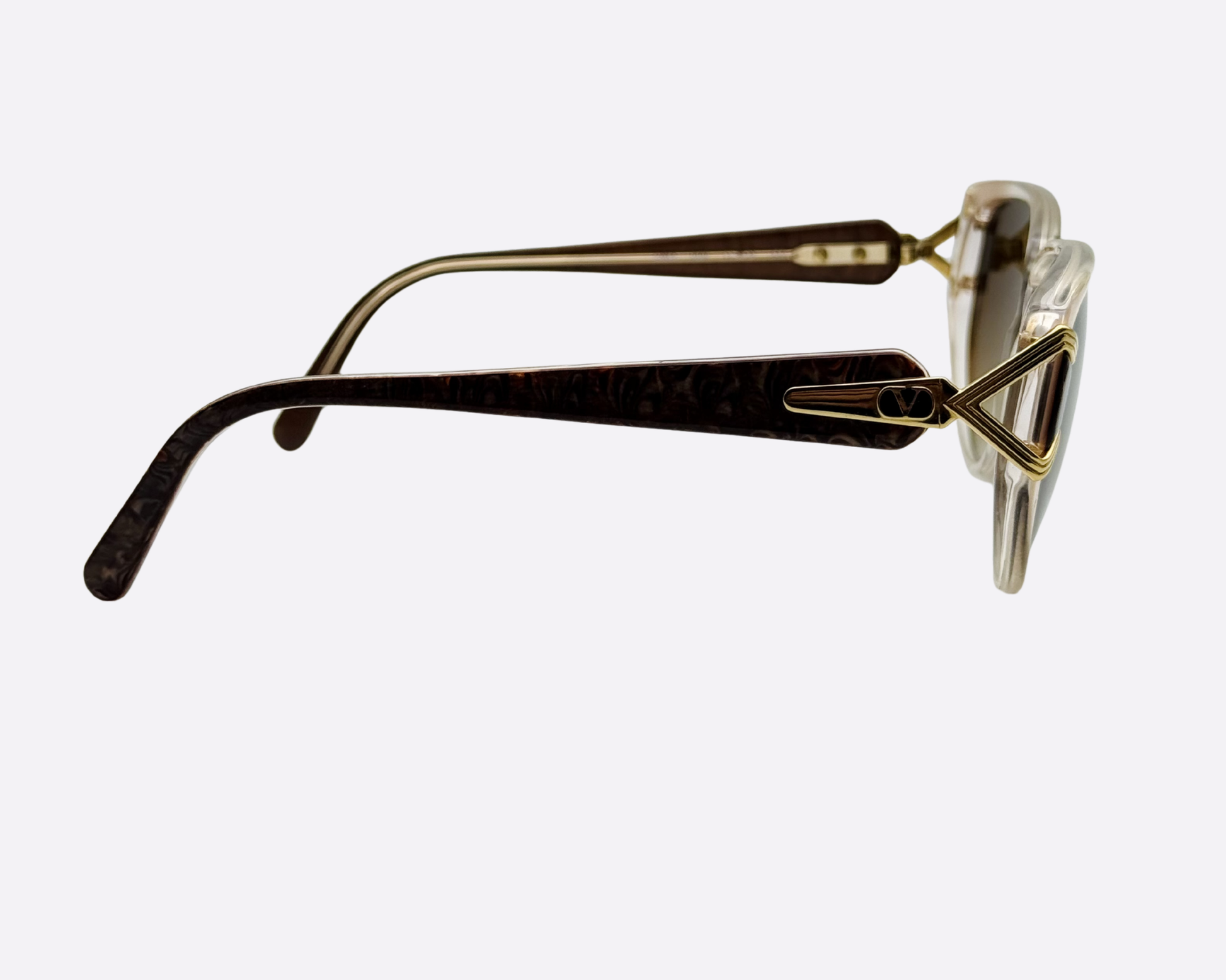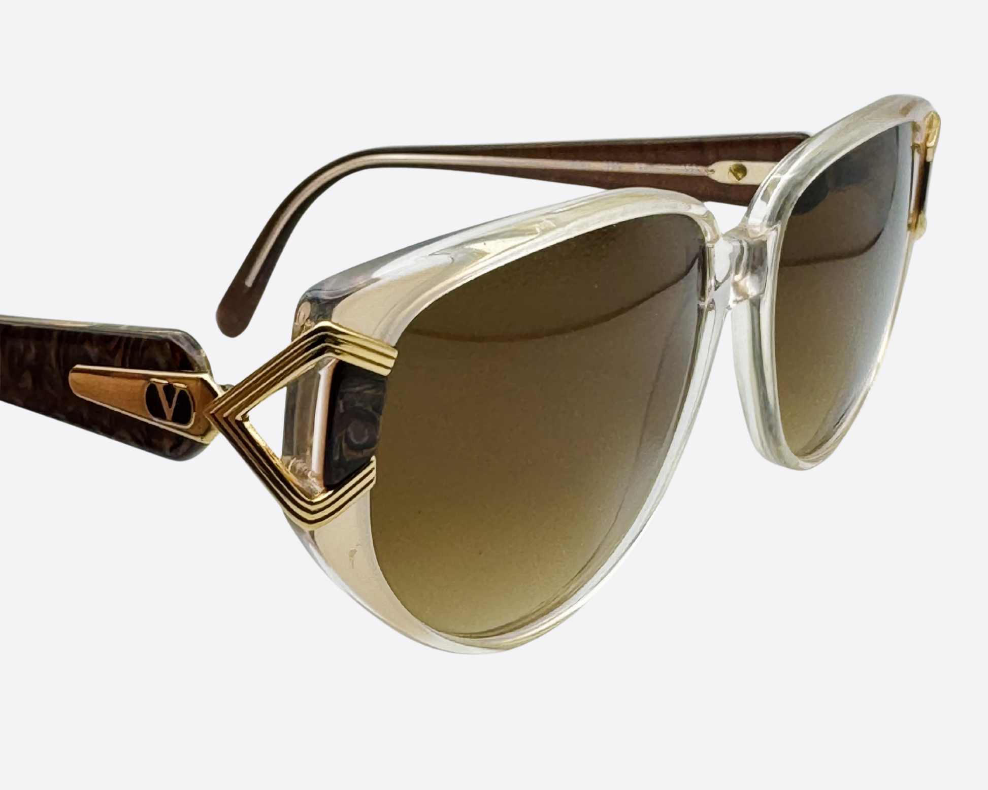 Este modelo Valentino de los años 80 es una montura técnica de acetato fabricada en Italia. El diseño presenta un frontal translúcido en tono champán combinado con herrajes geométricos de metal dorado en las bisagras y puntas de las patillas en marrón jaspeado. Representa la producción decorativa de gafas italianas de finales del siglo XX, caracterizada por la metalistería de alto relieve y la construcción con materiales mixtos.