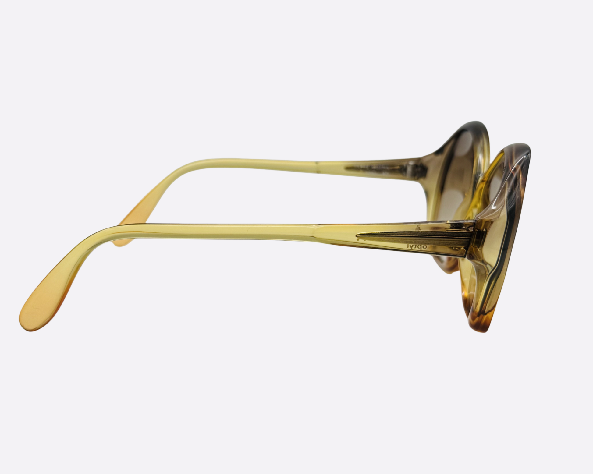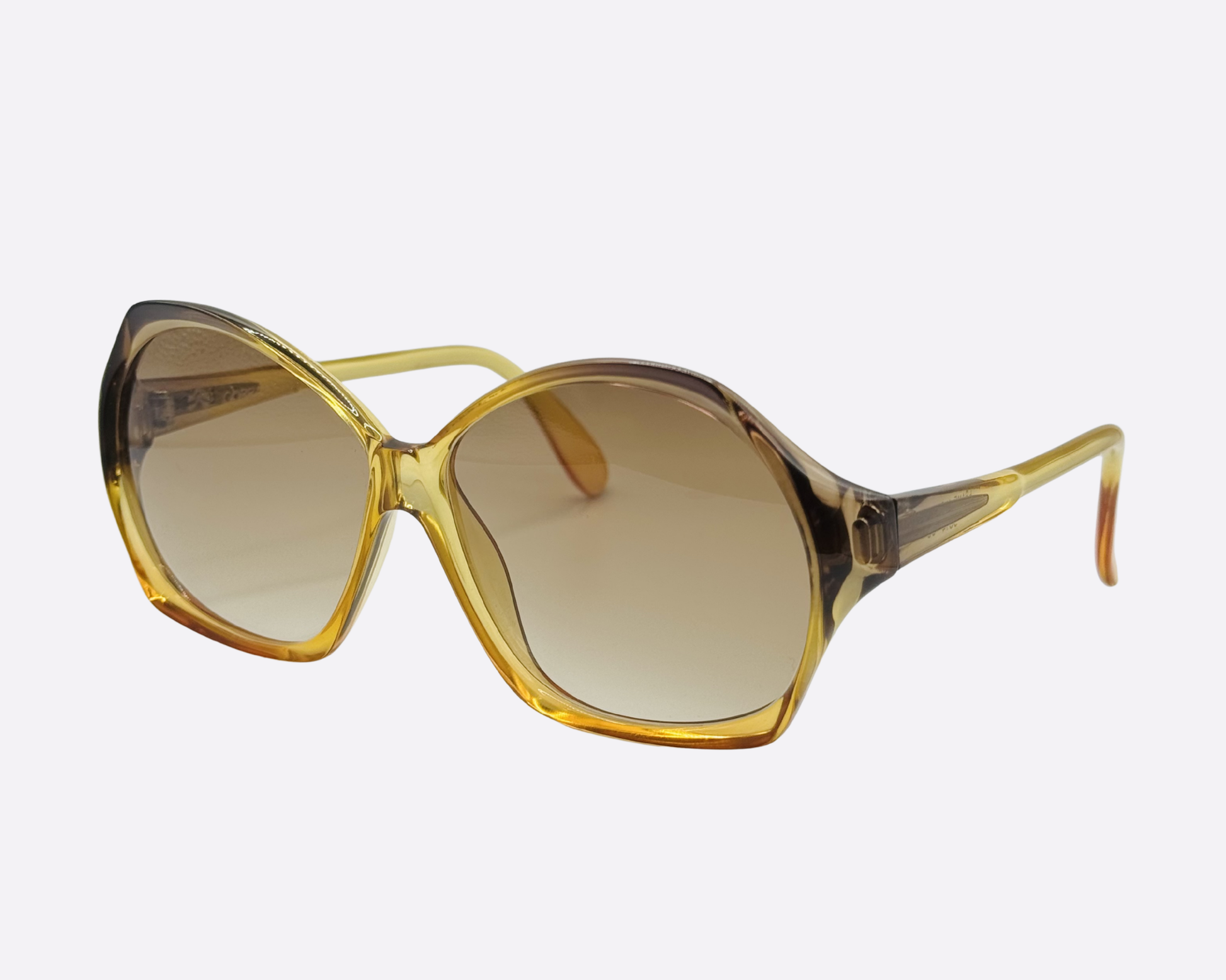 Model 3014 features a striking silhouette with a unique hexagonal-butterfly shape. The frame showcases a beautiful two-tone gradient, transitioning from a sophisticated deep smoke brown to a warm honey amber. The translucent quality of the optyl catches the light beautifully, highlighting the superior craftsmanship associated with vintage Austrian eyewear.